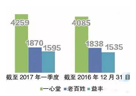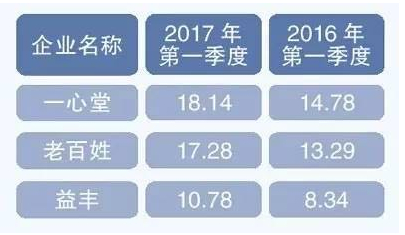 根據上圖所示的一心堂、老百姓、益豐這三大上市公司2017年一季度連鎖門店總數及連鎖營收總數計算,這三家公司旗下每家店一季度平均收入分別在45萬左右、90萬左右和68萬左右,由此可知三家公司中一年預估收益多的有360萬左右(一心堂),就算是少的也有180萬左右(益豐)。