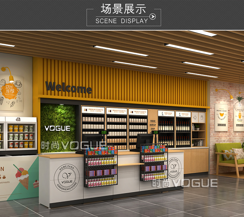 本款便利店收銀臺是時尚貨架為連鎖便利店設計生產的一款多功能組合式便利店收銀臺,如需了解更多小型便利店收銀臺,請咨詢客服人員!