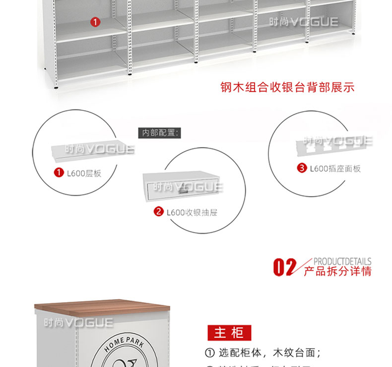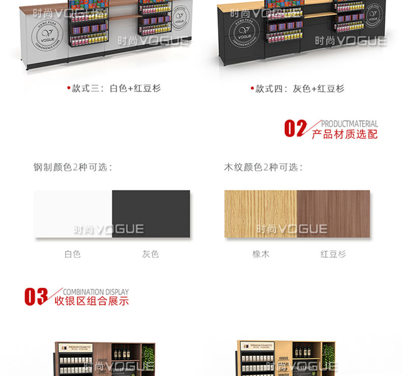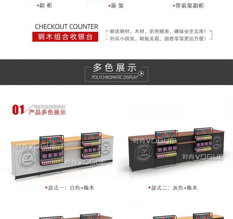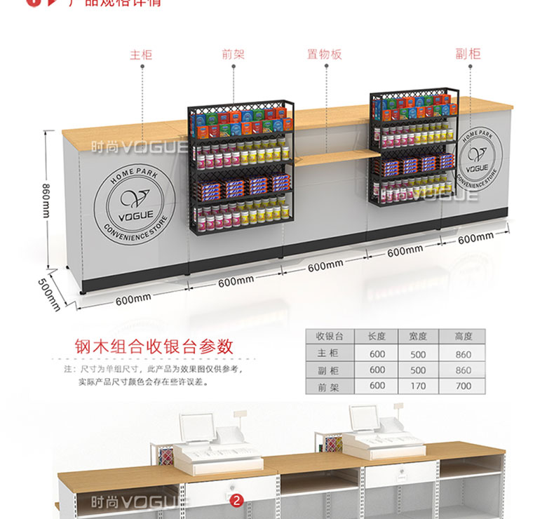 【特點】組合形式,滿足不同收銀區需求;精選材質使用壽命長;擴展側面空間增強收銀臺功能